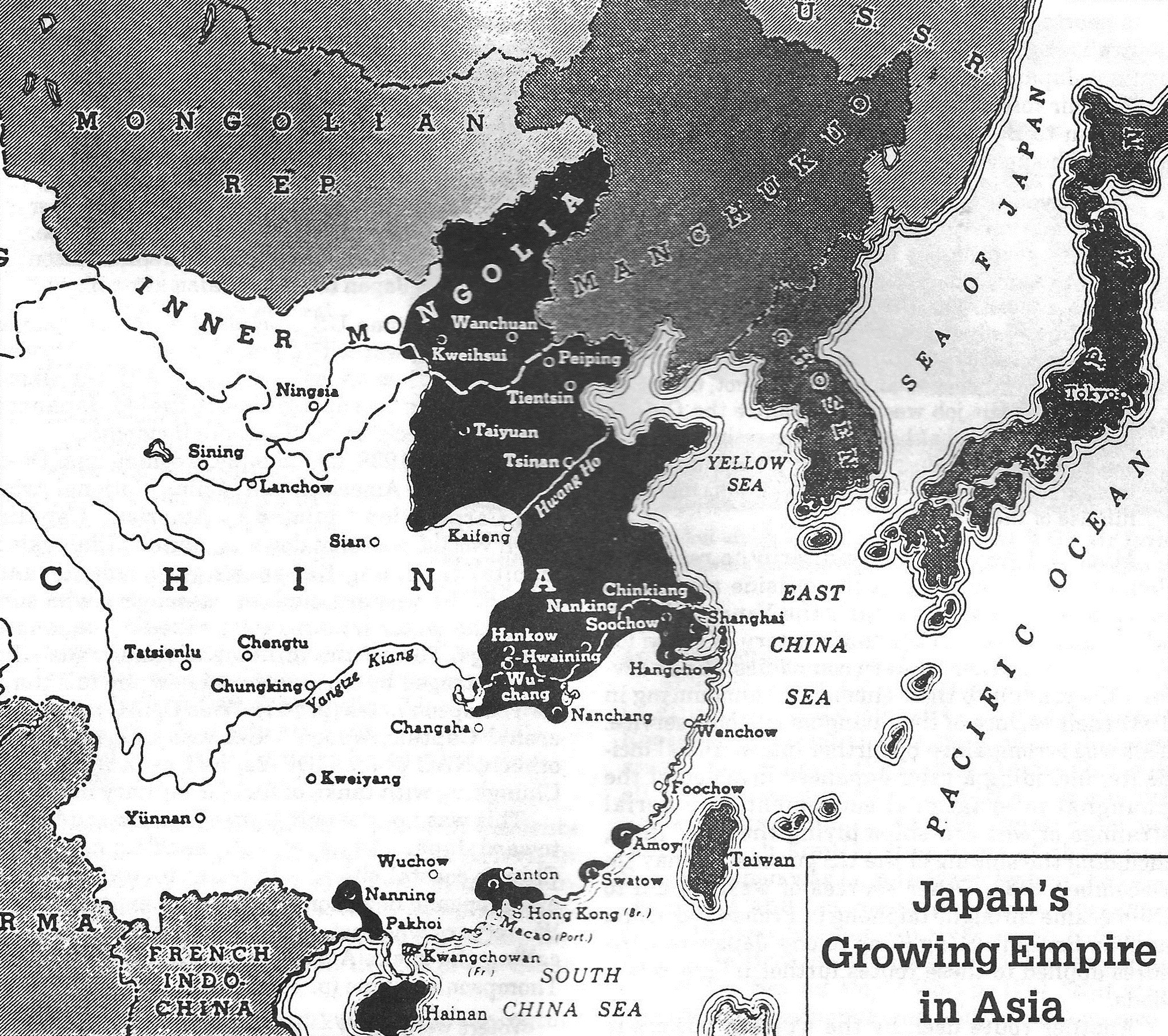 Japan had already acquired Taiwan in 1895, and in 1910 it annexed Korea (Chosen). In 1932, it established the puppet state of Manchukuo in northeast China. By December 1939, Japan seized control of the vast areas of China shown here in black.