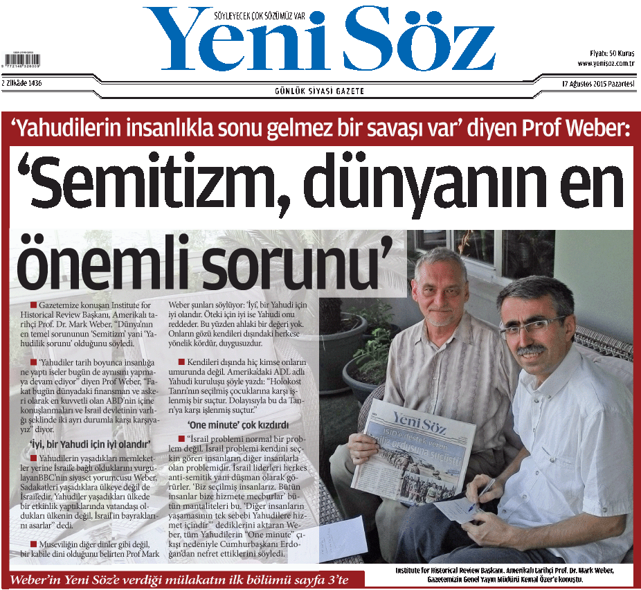 ![]() Front page of the Turkish newspaper Yeni Söz (“New Word”) with a portion of the lengthy interview with Mark Weber that appeared, with photographs, in four parts over two consecutive days’ issues. |